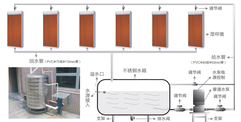 水簾主要由高分子水簾紙組成,濕紙簾是一種特殊的產品,經過特殊處理,結構強度高,耐腐蝕,使用周期達六年以上。我們可以從水簾紙的透光性中看出較低的阻力與透氣性這說明水簾紙具有優良的透氣與濕水性,可以保證水均勻的淋透整個水簾墻,水簾是紙的立體空間設計為水和空氣的熱交換提供了蒸發的最大表面積,高耐水性能又具有較大的蒸發比,水簾的外框有鋁合金或者鍍鋅板做成,選擇這兩種材料的目的是防止生銹,外框的結構是經過精心設計的,上邊框里面有安裝進水管的卡槽,進水管可以固定在上邊框的里面,進水口在中間,水從進水口流入之后經過進水管均勻的向整個紙簾分散,安裝外邊框的時候先在上邊框中放置一排橫向的紙簾,這些橫向的紙簾起著分水的作用,保證整個紙簾均勻的向下滲水,再把已經準備好的水簾紙并列排起來放進接好的框架中,把已經拼接好的水簾紙豎放起來然后在水簾的四邊鉆孔同時用氣釘固定,這樣一個水簾就制作完成了。