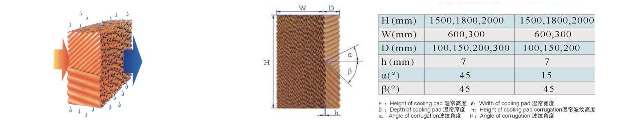 濕簾裝在密閉房舍一端山墻或側墻上,風機裝在另一端山墻或側墻上,降溫風機抽出室內空氣,產生負壓迫使室外的空氣流經多孔濕潤濕簾表面時,使空氣中大量熱量進行轉化處理從而迫使進入室內的空氣降低10-15℃,并不斷的引入室內進行防暑降溫。